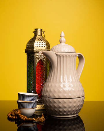Arabic tableware on a yellow background. Ramadan Kareem.