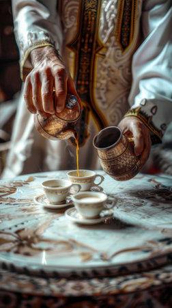 Traditional Arabian coffee service pouring from gold dallah into decorated cups in majlis with heritage textiles