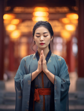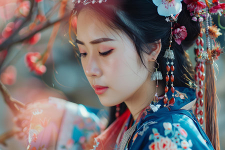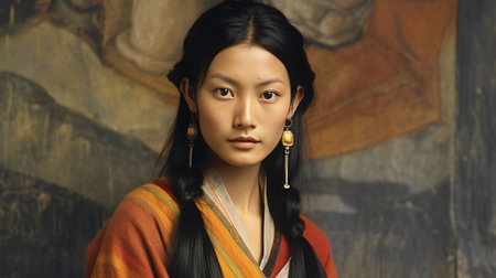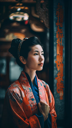 Serene young woman adorned in colorful traditional asian dress, expressing contemplation