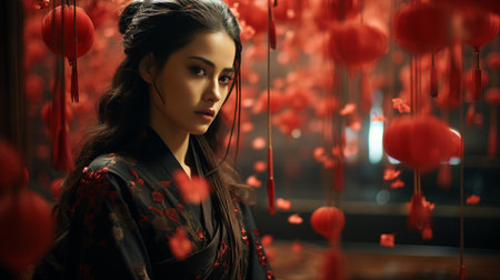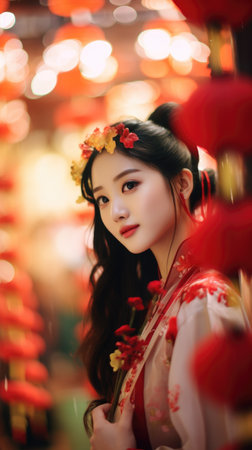 beautiful asian woman in chinese traditional costume with red lanterns