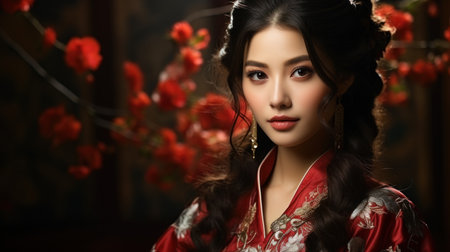 Asian chinese woman in traditional dress on red background. Chinese new year festival.
