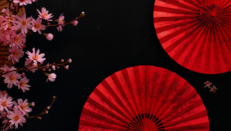 Two red fans rest beside pink cherry blossoms, creating a cultural scene. The dark background highlights the colors. The setting is suitable for a Japanese theme or celebration.