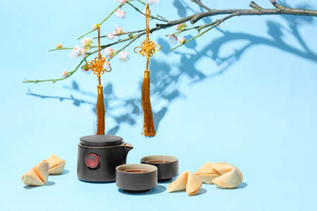 Composition with tasty fortune cookies and traditional Chinese tea on color background