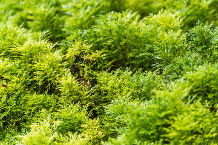 Yellow young shoots thuja occidentalis growing in garden. Evergreen coniferous tree twigs of western thuja salland. Nature concept for design family cupressaceae. Foliage on branch