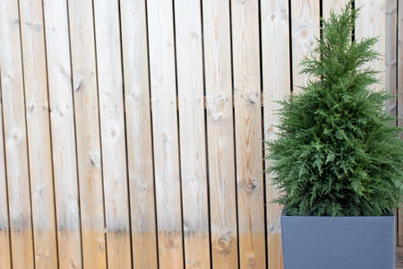 Coniferous green tree spruce on the background of wooden boards. Copy space, concept of a winter holiday theme. Christmas.