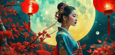 Beautiful Chinese woman in traditional costume with red lanterns and full moon