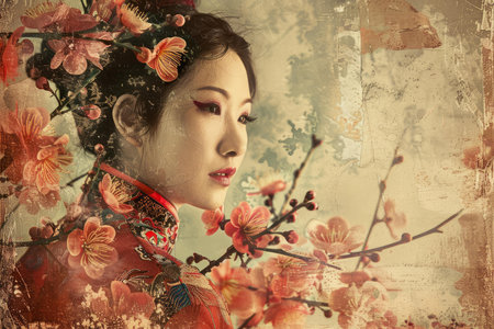 Artistic rendition of a pensive woman adorned with a traditional floral kimono, merging with a textured, vintage backdrop