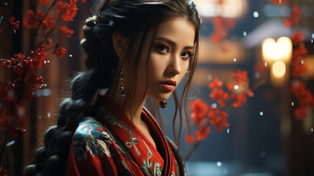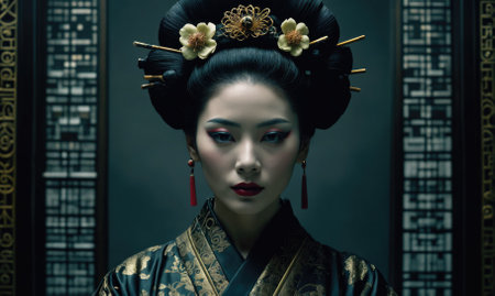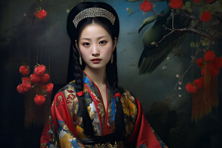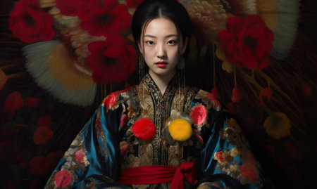 Portrait of a graceful young woman adorned in beautiful asian ceremonial dress with intricate makeup and hairstyle