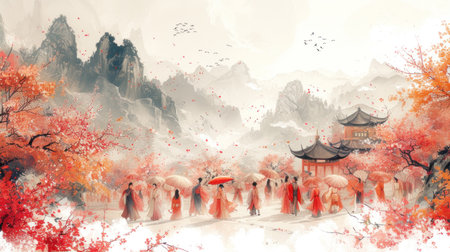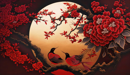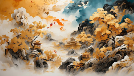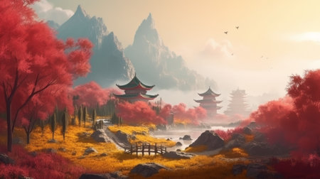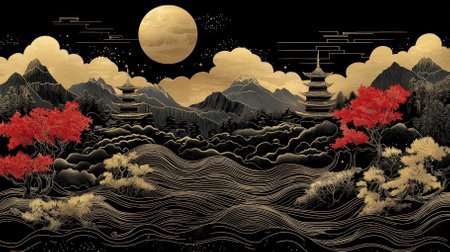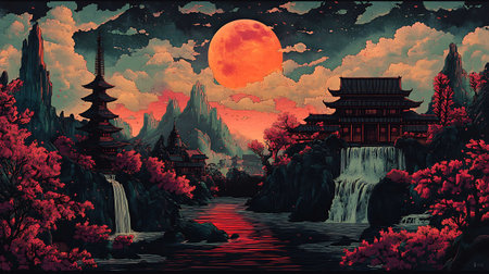 A stunning portrayal of an Asian landscape featuring majestic mountains, vibrant red trees, and a glowing golden moon, creating a serene and tranquil atmosphere.