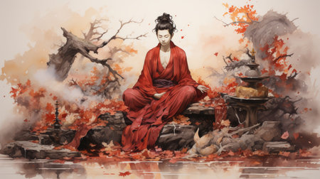 A monk contemplates beside a lake with autumn leaves and a temple backdrop. Resplendent.