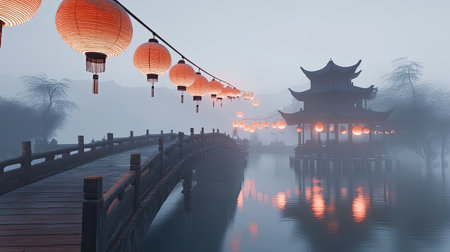 A serene landscape depicting a traditional pavilion illuminated by lanterns, set against a misty backdrop, reflecting tranquility and cultural beauty.