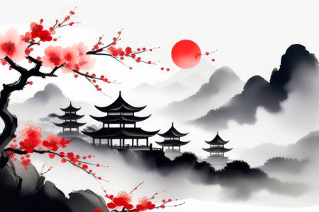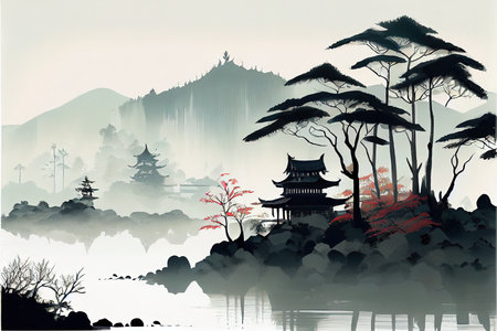 An AI-generated illustration of an ink wash painting of an ancient Asian temple on a hill