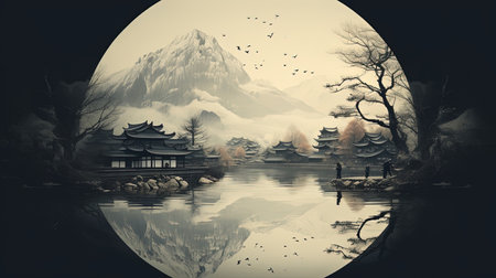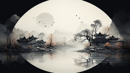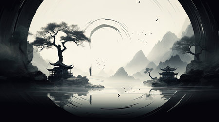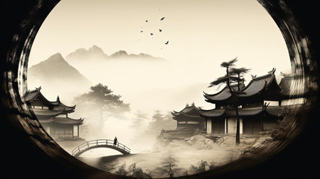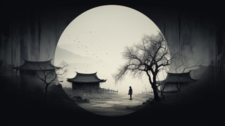 Immerse yourself in the tranquil beauty of rural China with this stunning monochrome illustration inspired by Joel Robison's style. Explore the landscape scenics, circular shapes, and zen-inspired elements that capture the essence of villagecore. Let the physically based rendering bring this captivating scene to life.