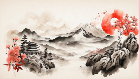 Traditional Japanese ink wash landscape painting with mountains, river and trees. Traditional ink painting style gohua, sumi-e, u-sin