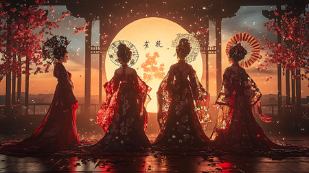 Three women in red kimonos stand before a large moon, surrounded by falling cherry blossoms. Warm light, pixel art style