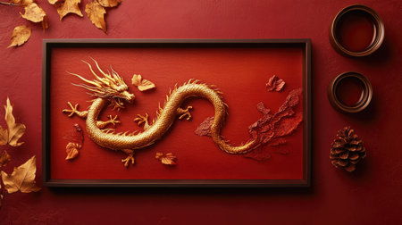 A stunning golden dragon sculpture elegantly displayed on a rich red backdrop, complemented by natural elements like leaves and a pine cone, creating a striking visual.