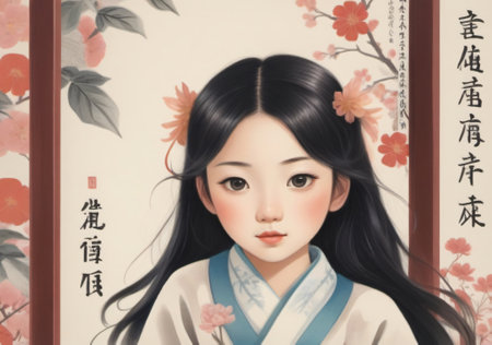 A young Korean girl in a traditional dress standing amidst wild cherry blossoms, AI-generated.