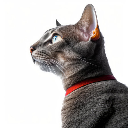 a cat wearing a red collar and looking up