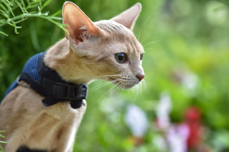 Abyssinian cat of fawn color, close-up portrait, walks along the lawn with flowers, space for text