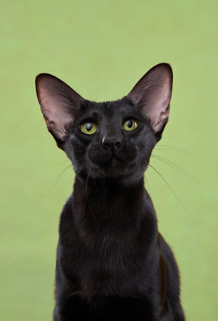 black Oriental Shorthair cat poses a golden yellow