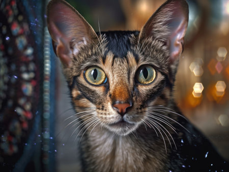 A curious cat sits still, its bright eyes reflecting the soft glow of the background.