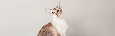 Beautiful colorpoint blue-eyed oriental breed cat looking in camera. Fluffy hairy domestic pet with blue eyes relaxing at home. Adorable furry animal feline friend. Web banner header.