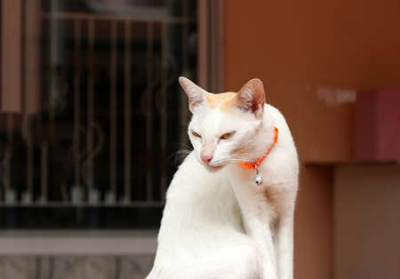 White cat sitting and orange cat strap. It is a small domesticated carnivorous mammal with soft fur.