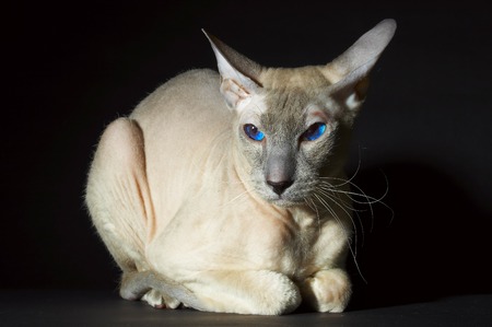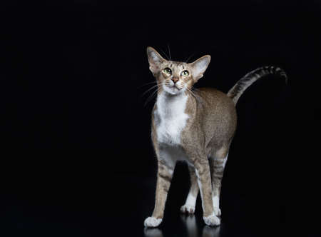 Oriental Cat Siamese breed, black background in the studio