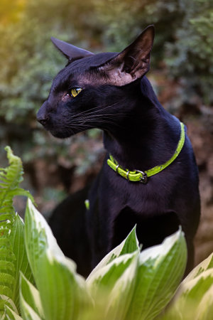 Portrait of a black oriental cat with a green collar in profile