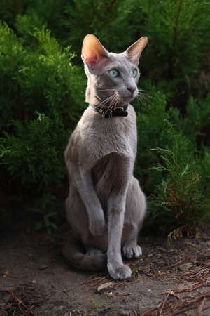 Beautiful Grey Young Cat Sitting on Ground Near Coniferous Bush In Summer Park. Breed Oriental.