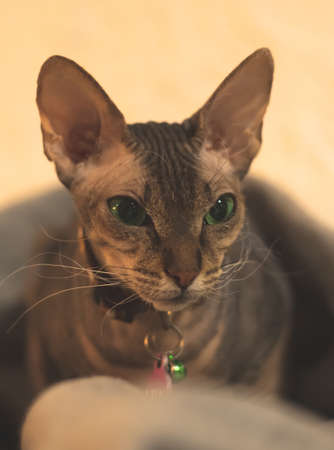 Sphynx in a plaid, warm-tone portrait of a cat in home and cozy atmosphere