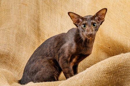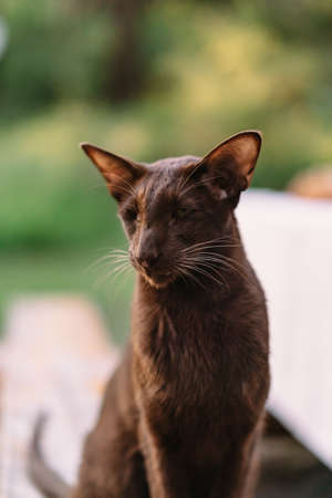 Portrait of a brown oriental cat. A cat with green eyes in close-up
