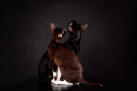 Backwards view of two oriental breed cats of black and brown color are sitting close together against black background
