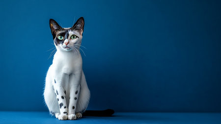 Curious Black and White Cat with Striking Green Eyes on a Deep Blue Background, Studio Shot