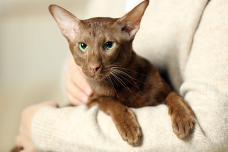 Woman with cute Oriental Shorthair cat at home, closeup. Adorable pet