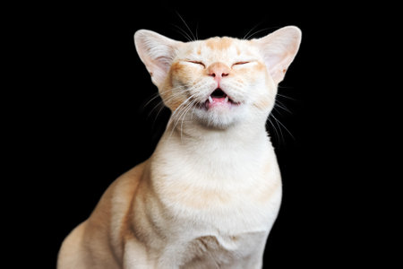 Burmese cat with open mouth on black background. Domestic cat smiling, funny cat isolated.