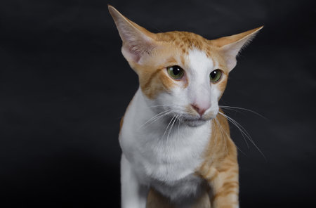 Oriental cat, short-haired pet on a dark background.