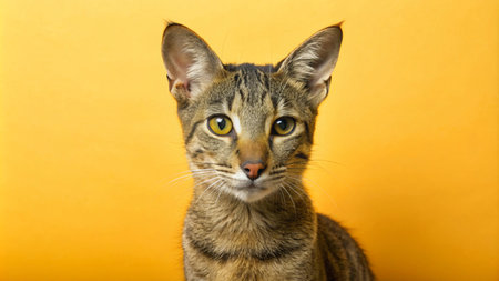 A brown tabby cat with large ears and yellow eyes stares directly at the camera against a yellow background.