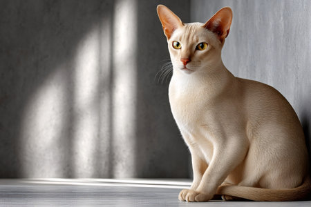 Cream colored singapura cat sitting gracefully in a modern, minimalist apartment, illuminated by soft window light