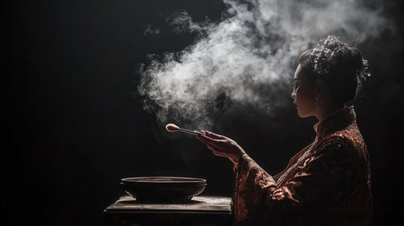 A woman gracefully holds a ladle, creating a cloud of steam against a dark background, evoking tradition and mystery in culinary arts.