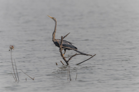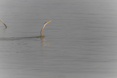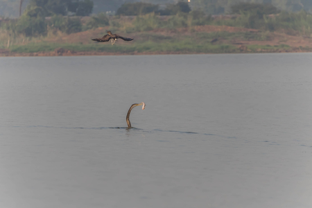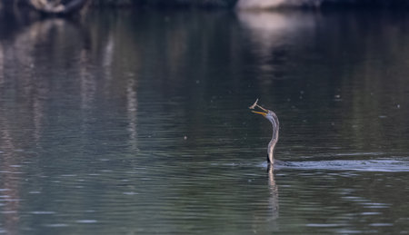 Oriental darter (Anhinga melanogaster) or snake bird fishing in river during winter morning in forest.