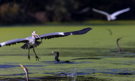 Great Blue Heron (Ardea herodias) landing on a swamp