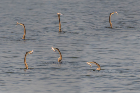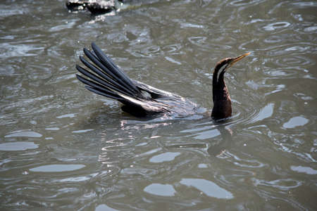 Oriental darter (Anhinga melanogaster) or snake bird fishing in river.