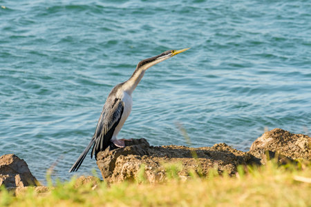 Australasian darter(Anhinga novaehollandiae) a large water bird with dark plumage and a long neck, the animal sits on a rock on the seashore.