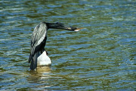 Australasian darter(Anhinga novaehollandiae) a large water bird with dark plumage and a long neck, the animal sits on a stone on the river bank.