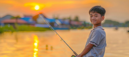Young Boy Holding a Fishing Rod, Standing by River at Serene and Peaceful Sunrise Moment.