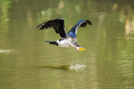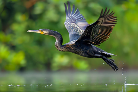 Majestic Black Cormorant Bird Taking Flight Over Tranquil Lake with Spread Wings and Water Droplets AI Generative