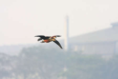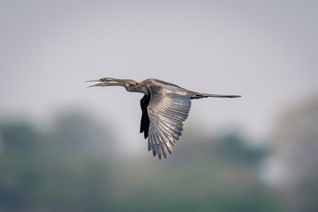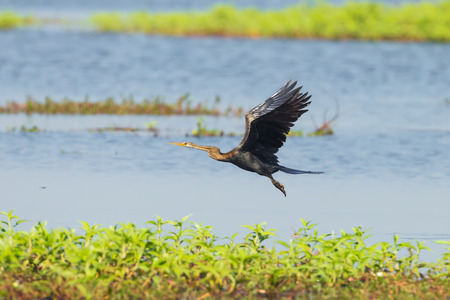 Oriental Darter or Indian snake bird (Anhinga melanogaster) in flight over the river.