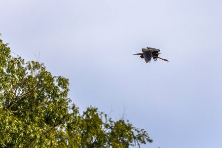 Gray heron flies over the water. Wild marsh bird with long legs and beak