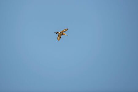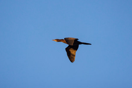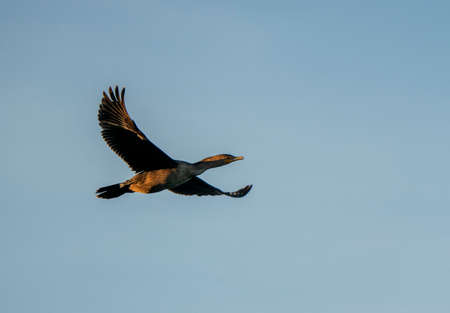 Great Cormorant (Phalacrocorax carbo) in flight against blue sky